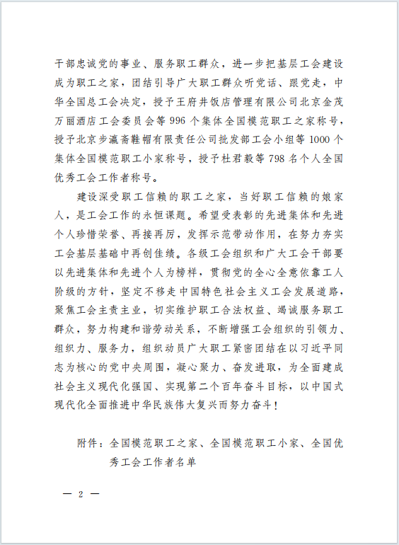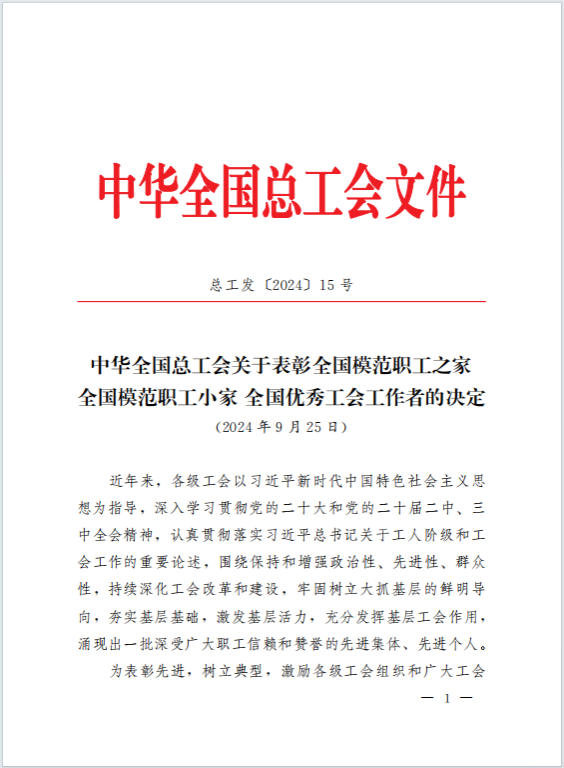 近日,中华全国总工会印发《关于表彰全国模范职工之家 全国模范职工小家 全国优秀工会工作者的决定》(总工发 〔2024〕15号)文件,对近年来涌现出的一批深受广大职工信赖和赞誉的先进集体、先进个人进行表彰。公司纪委委员、公司党委书记、原工会常务副主席朱奕远被授予“全国优秀工会工作者”荣誉称号。