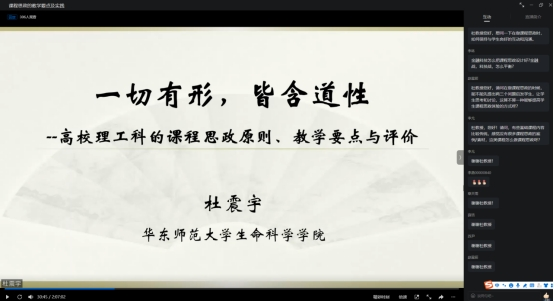 多名教师就“应用类知识如何与课程思政相结合”“如何营造课程思政的课堂氛围”“新教师如何开展课程思政”等问题与杜教授展开互动交流。老师们纷纷表示,本次讲座开阔了理工科老师课程思政的眼界和思路,对如何在专业教学中做好思想教育具有很强的现实指导意义。
