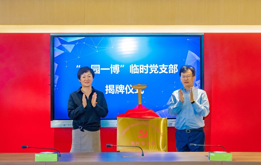 其次陆丹恩副主任与谢宏书记一起为平湖市智创园嘉兴公司yl永利集团官网登录“一园一博”服务工作站临时党支部揭牌。