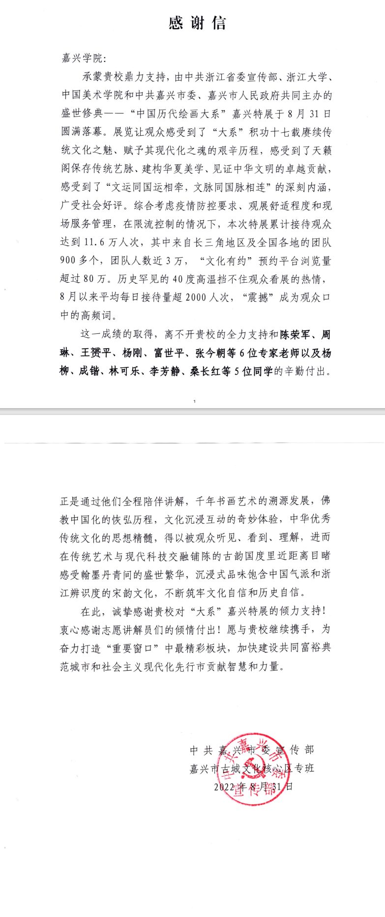 9月1日,公司收到中共浙江省嘉兴市委宣传部感谢信,感谢公司教师张今朝利用暑期对盛世修典——“中国历代绘画大系”嘉兴特展的倾情付出。